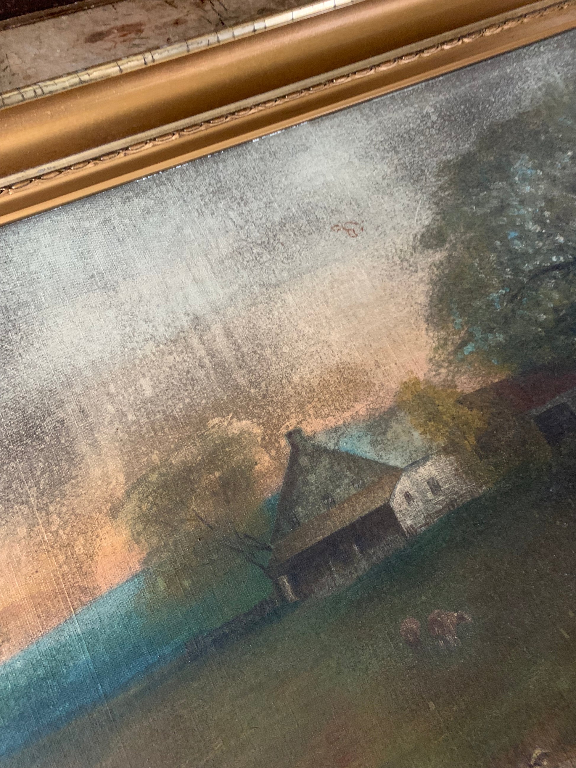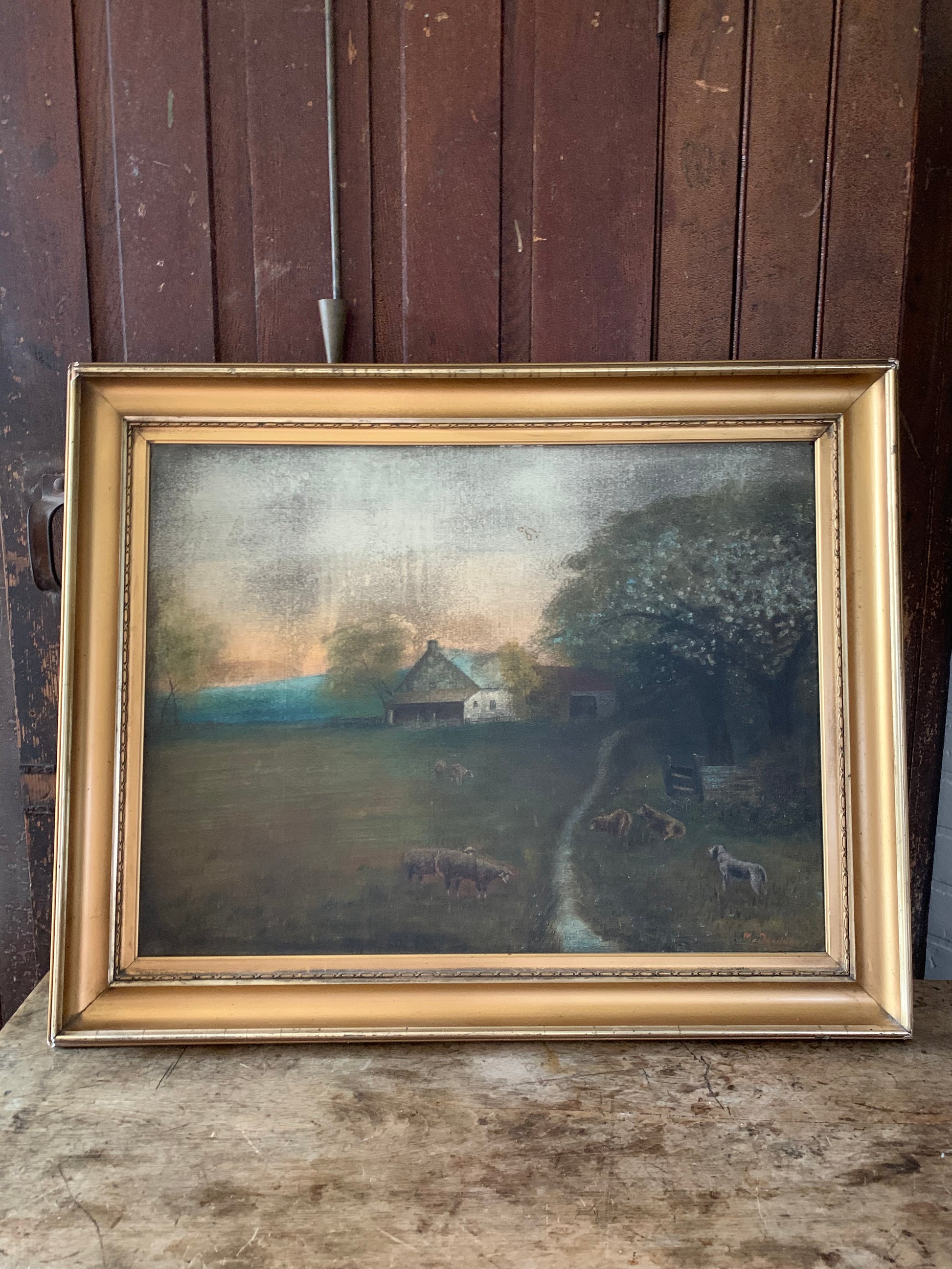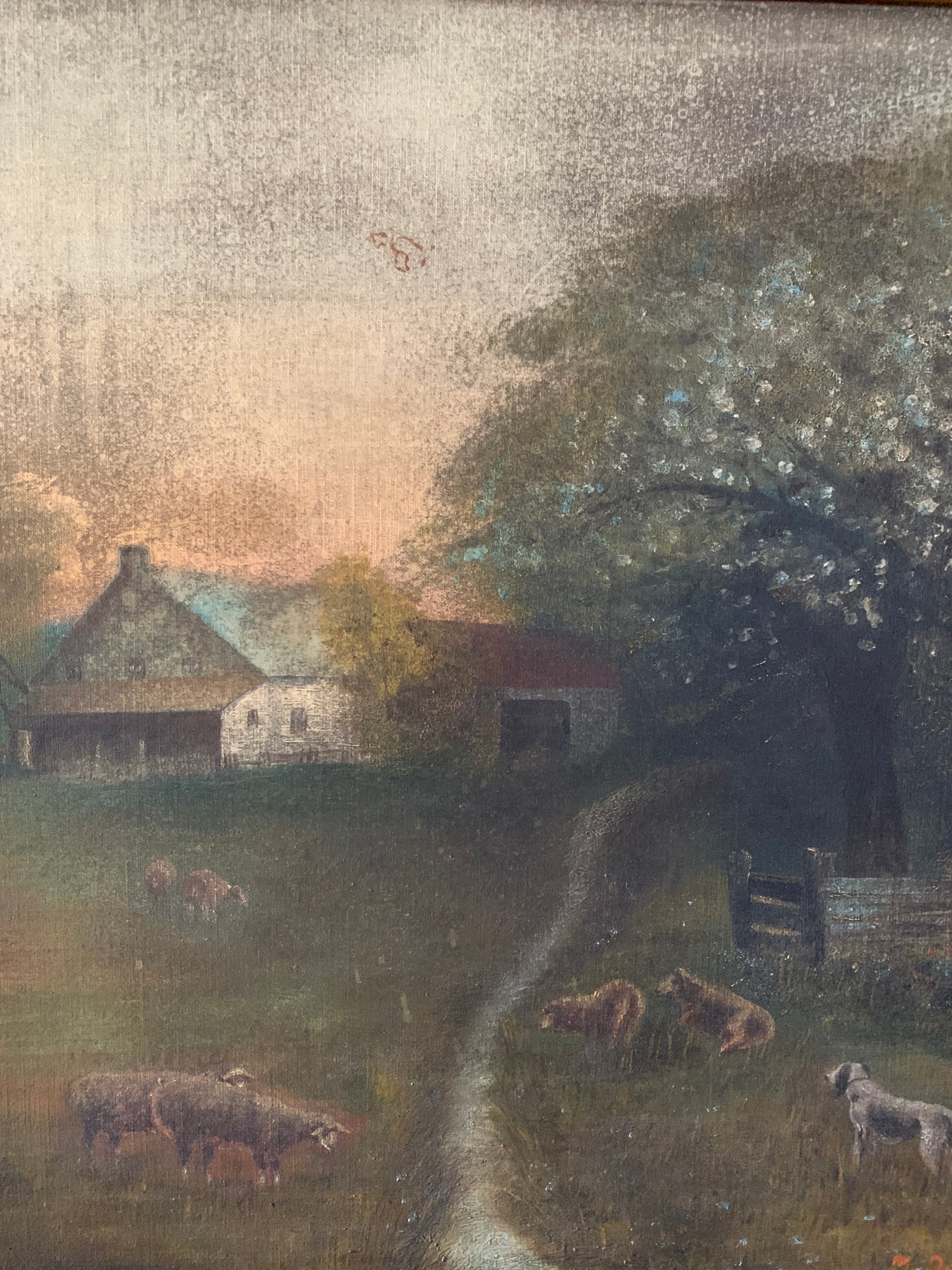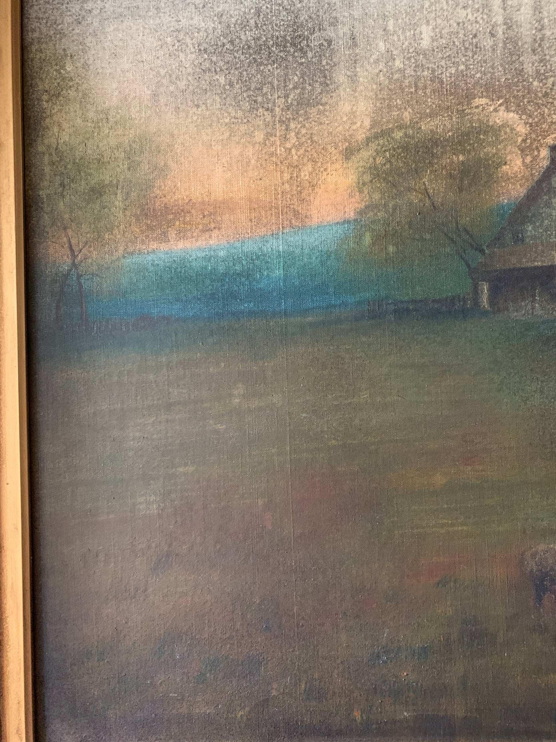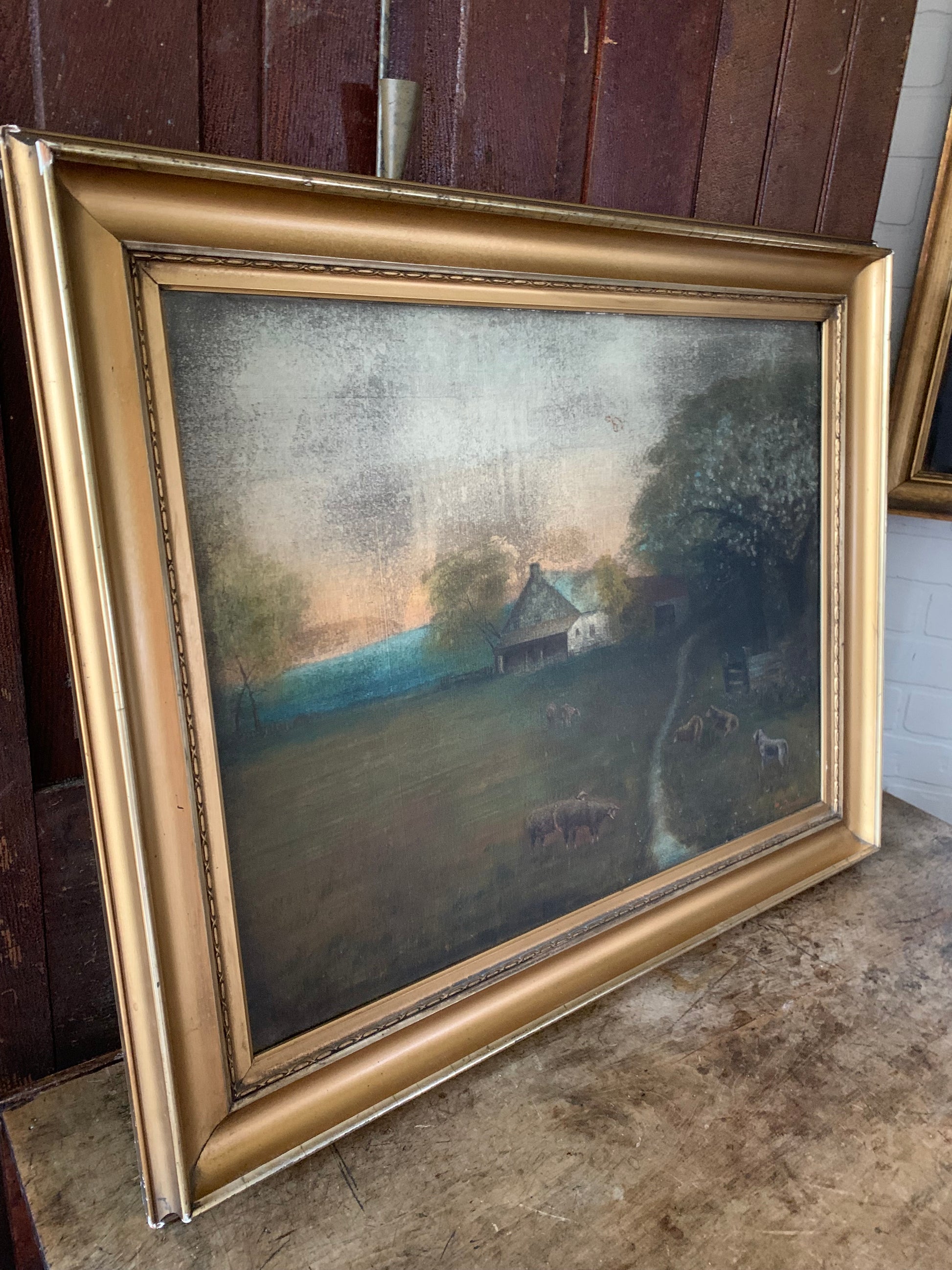 Antique large landscape oil painting on canvas| dog & sheep in pasture